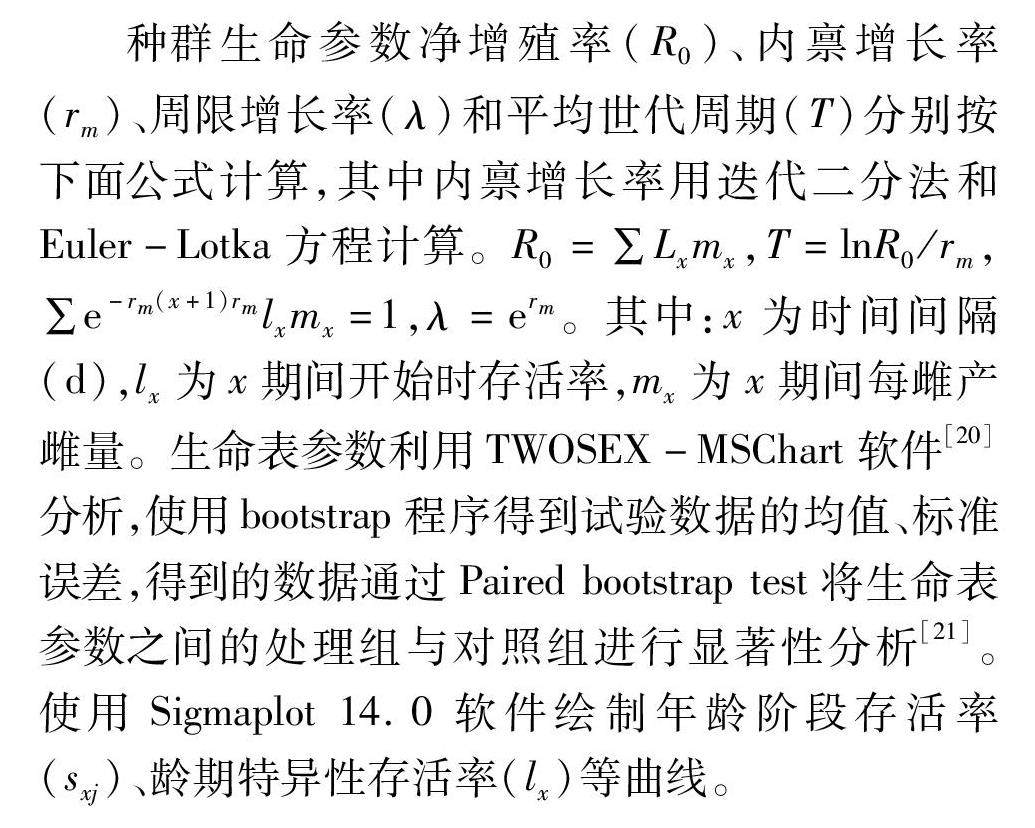 摘要:采用生命表分析法对比氟啶虫胺腈亚致死浓度对棉蚜和棉长管蚜种群生命表参数的影响。结果表明,氟啶虫胺腈LC20(1.02 μg/mL)处理棉蚜后G0代种群表现出种群净增值率(R0)降低,平均世代历期(T)缩短和种群加倍时间(DT)延长,但与对照均无显著差异;G1代种群的R0和rm较对照分别降低1.94和0.01。(剩余9094字)