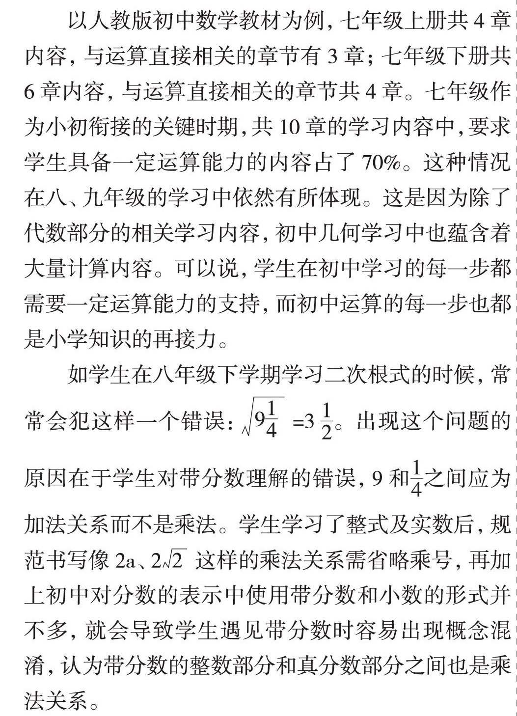 摘 要 从小学进入初中后,部分学生的数学学习会产生不适应,此问题值得研究解决,但当前关于小初数学衔接问题的研究多是对初中教师的教学给出建议。以《义务教育数学课程标准(2022年版)》中指出的数学学科核心素养为出发点,对比小学阶段与初中阶段数学核心素养表现的相同点与不同点,小学数学教师在小初数学学科素养连续性和进阶性培养中应重视运算能力、渗透抽象思想、关注推理过程、增强应用意识。(剩余6249字)
