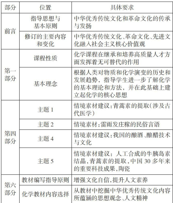 2014年9月,国务院颁布了《关于深化考试招生制度改革的实施意见》,对高考提出了新的要求一“要深化高考考试内容改革”。此后,与中华优秀传统文化相关的试题便在各年的高考化学全国卷中频繁出现。2021年,教育部发布的《中华优秀传统文化进中小学课程教材指南》,详细介绍了中华优秀传统文化在中小学课程教材中的融合路径。(剩余6497字)