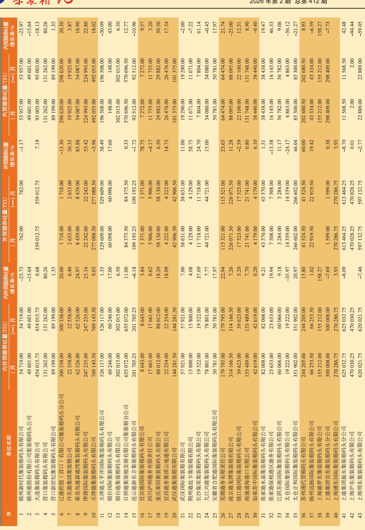 中国主要港口集装箱码头吞吐量快报(2026年1月)