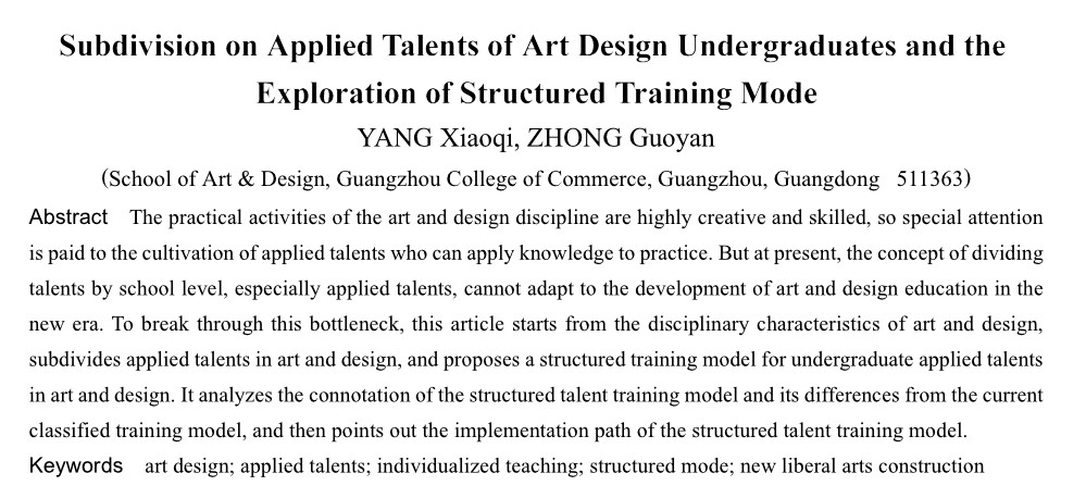 摘要 艺术设计学科的实践活动具有高创意性、高技能性,故格外注重能够将知识应用于实践的应用型人才的培养。但现阶段以学校层次划分人才,尤其是应用型人才的观念已经不能适应新时代艺术设计学科教育的发展。为突破此瓶颈,文章从艺术设计的学科特点出发,对艺术设计应用型人才进行细分,从而提出艺术设计本科应用型人才结构化培养模式,并解析了结构化人才培养模式的内涵,以及其与现阶段分类培养模式的不同,进而指明结构化人才培养模式的实施路径。(剩余6610字)