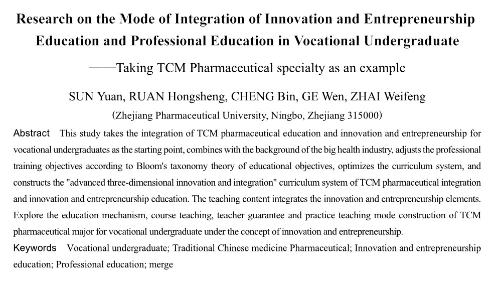 摘要 本研究以职业本科中药制药专业教育与创新创业融合为出发点,结合大健康产业背景,依据布鲁姆教育目标分类学理论调整专业培养目标,优化课程体系设置,构建中药制药融合创新创业教育的“进阶立体式专创融合”的课程体系,教学内容融入创新创业元素,探究创新创业理念下的职业本科中药制药专业育人机制、课程教学、师资保障、实践教学的教育模式构建。(剩余4144字)