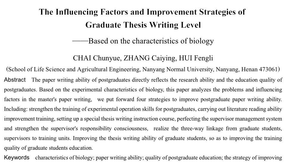 摘要 研究生的论文撰写能力和水平直接反映了研究生的科研能力,影响研究生的培养质量。文章基于生物学实验性学科的特点,分析了目前生物学相关专业研究生论文撰写存在的问题及其影响因素,在此基础上提出了四条研究生论文撰写能力提升策略。加强对研究生实验操作技能训练,开展文献阅读能力提升训练,开设专门的论文写作指导课程,完善导师管理制度增强导师责任意识,真正实现从研究生、导师,到培养单位的三方联动,提高研究生的论文撰写能力,从而提高研究生的培养质量。(剩余6730字)