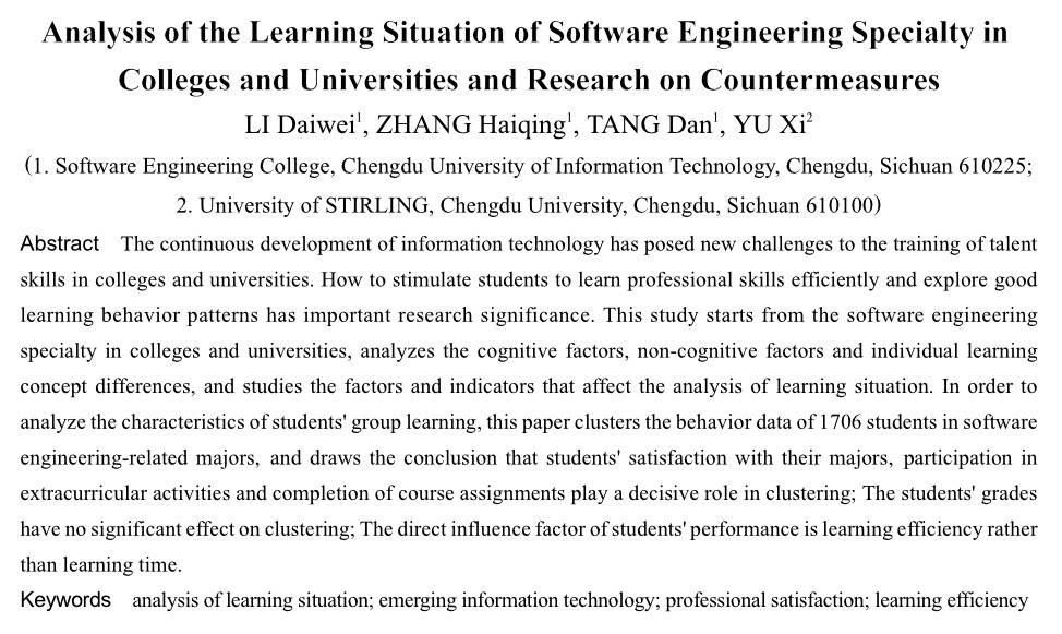 摘要 信息技术的不断发展对高等院校人才技能培养提出了新的挑战,如何激发学生高效地学习专业技能,探究优良的学习行为模式具有重要的研究意义。本研究基于高等院校的软件工程专业,从认知因素、非认知因素及个体学习观念差异三个角度,研究了学情分析和影响学情分析的因素指标。为了对学生的群体学习特征进行分析,文章对软件工程相关专业的1706条学生的行为数据进行聚类,得出结论:学生对所学专业满意度、参加课外活动的情况及课程作业完成情况对聚类具有决定性作用;学生成绩对聚类并无显著影响;学生成绩的直接影响因素是学习效率而非学习时间。(剩余4482字)