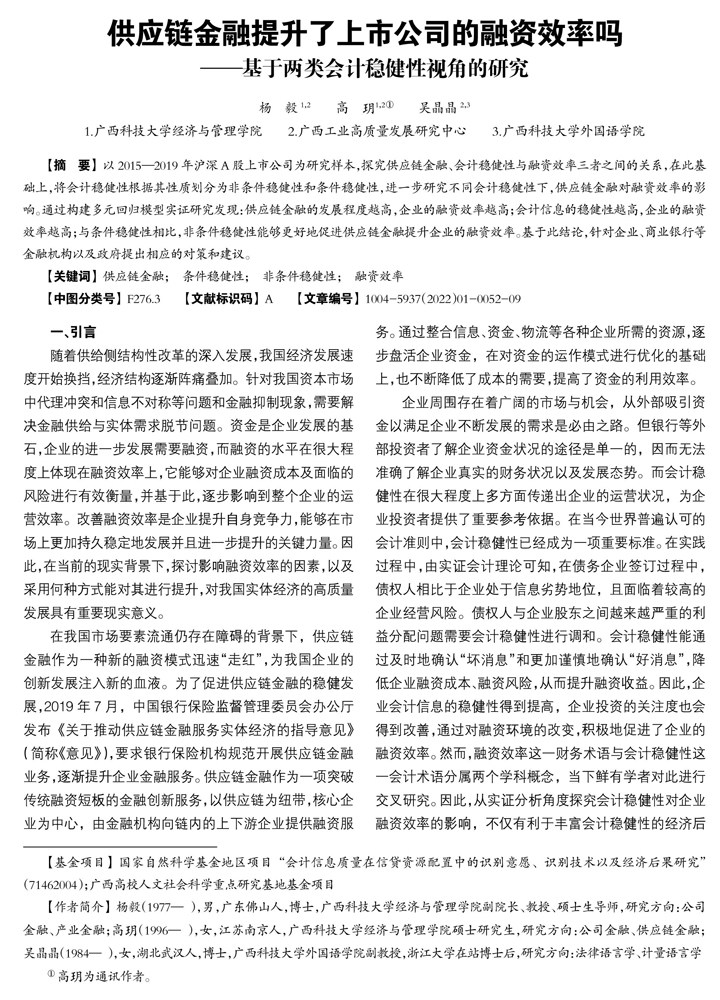 【摘 要】 以2015—2019年沪深A股上市公司为研究样本,探究供应链金融、会计稳健性与融资效率三者之间的关系,在此基础上,将会计稳健性根据其性质划分为非条件稳健性和条件稳健性,进一步研究不同会计稳健性下,供应链金融对融资效率的影响。通过构建多元回归模型实证研究发现:供应链金融的发展程度越高,企业的融资效率越高;会计信息的稳健性越高,企业的融资效率越高;与条件稳健性相比,非条件稳健性能够更好地促进供应链金融提升企业的融资效率。(剩余10886字)