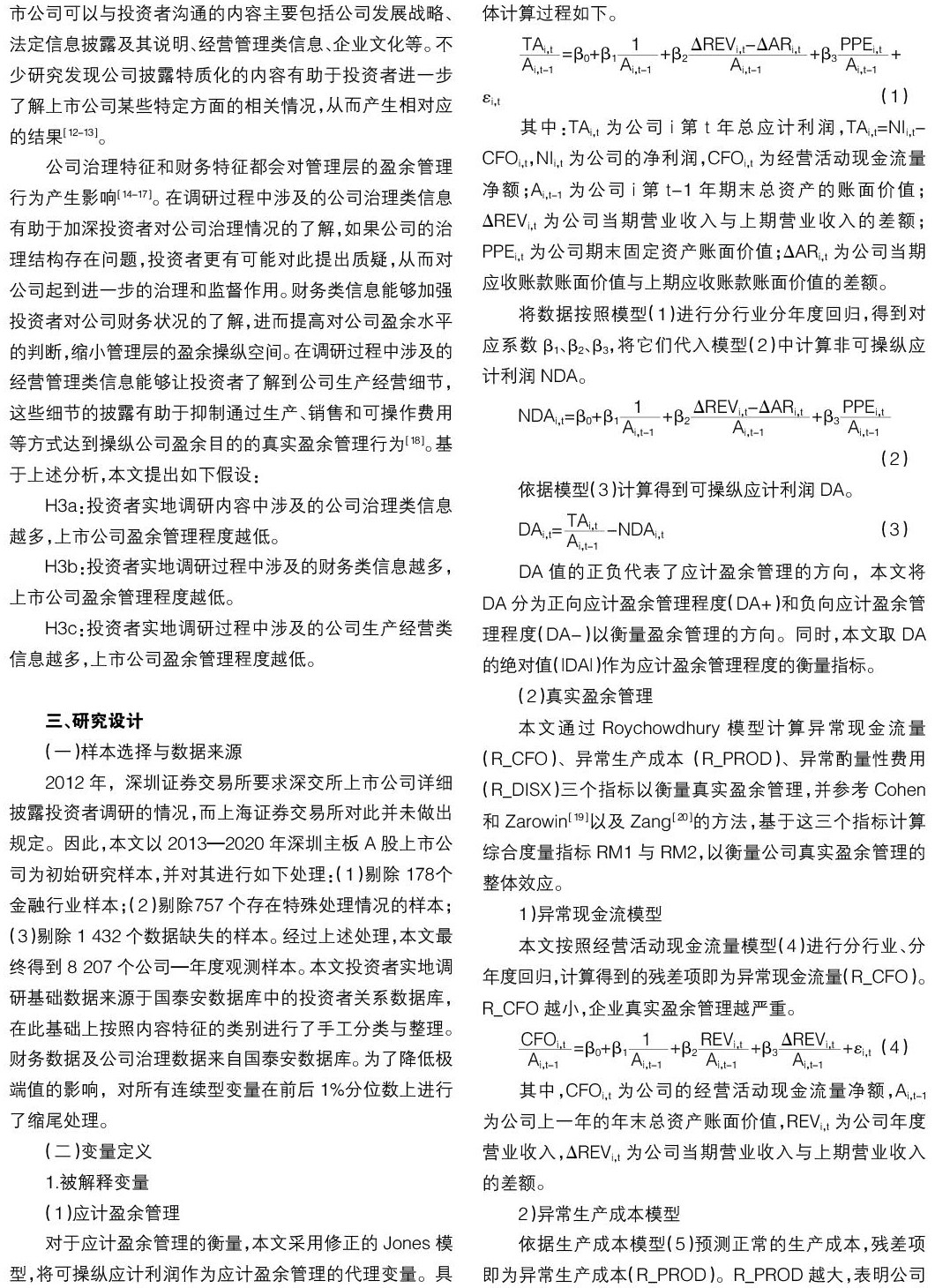【摘 要】 以2013—2020年深圳主板A股上市公司为研究对象,从调研强度、调研内容深度和相关度三个方面对实地调研活动特征进行刻画,考察了投资者实地调研活动对公司盈余管理的影响。研究发现,投资者实地调研强度越大、调研内容越深及相关性越高,上市公司的应计盈余管理和真实盈余管理行为越能得到抑制,投资者实地调研对真实盈余管理行为的抑制主要体现在异常生产成本和异常酌量性费用类行为的抑制。(剩余13476字)