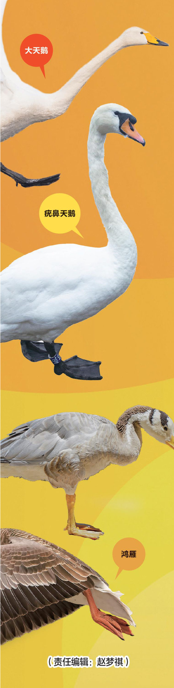 其实,在古文中,“鸿”指“鸿雁”。“重于泰山,轻于鸿毛中的“鸿”,也是指鸿雁,它是人们熟悉的大雁的代表。而“鹄”则指大雁的“亲戚”一一天鹅,也是一类大型水鸟。