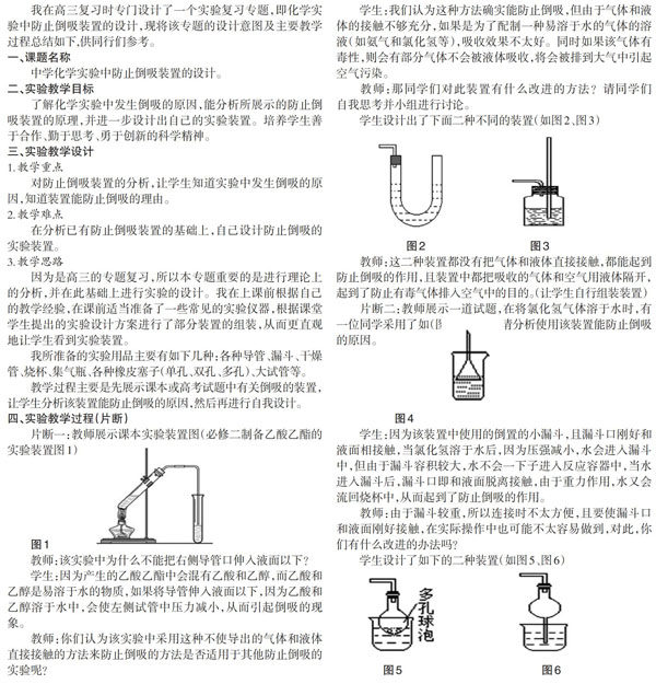 我在高三复习时专门设计了一个实验复习专题,即化学实验中防止倒吸装置的设计,现将该专题的设计意图及主要教学过程总结如下,供同行们参考。(剩余1690字)