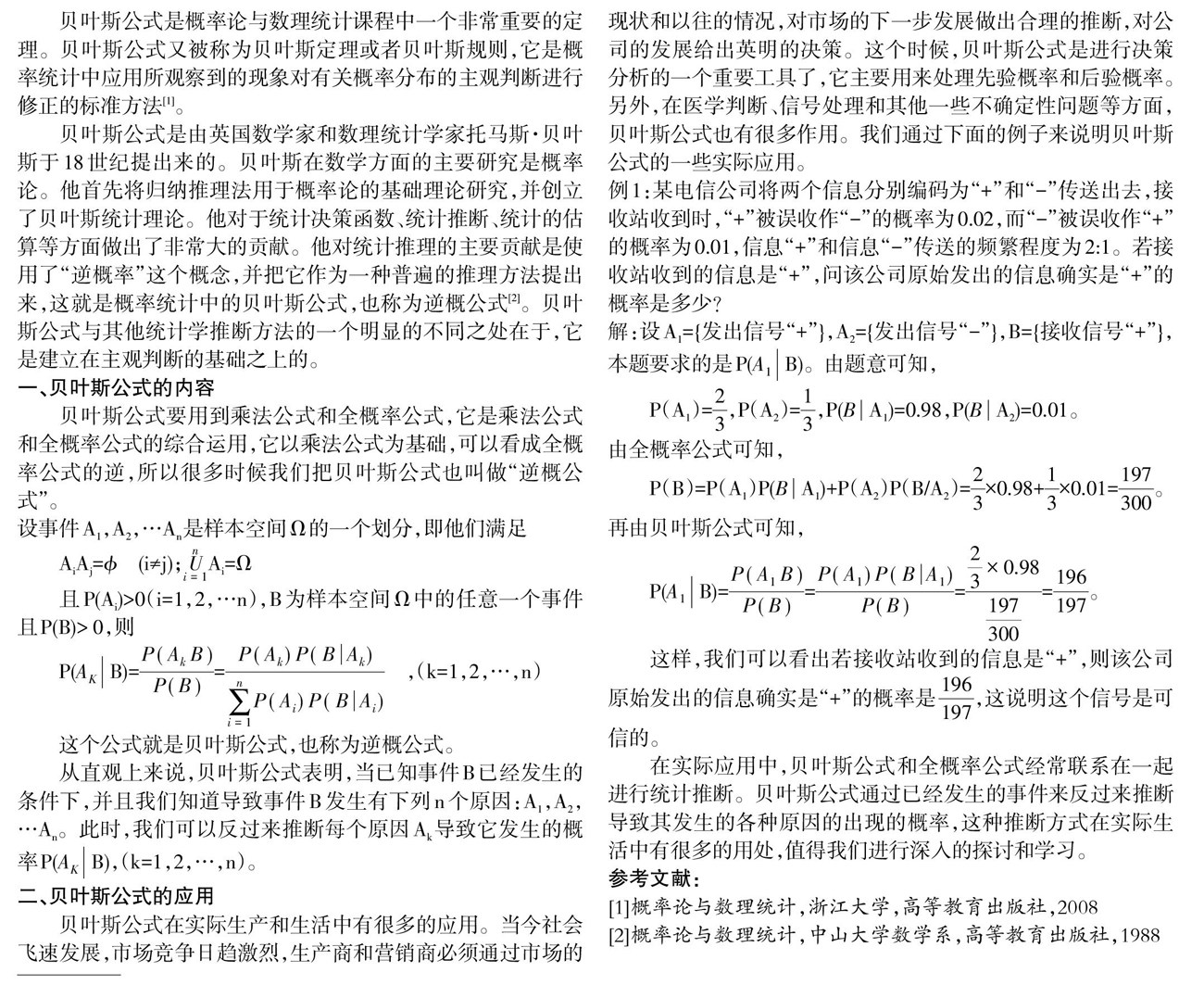 摘 要:贝叶斯公式是概率论与数理统计中一个非常重要的定理,它是一种非常重要的统计推断方法。本文主要讨论贝叶斯公式的一些简单应用。