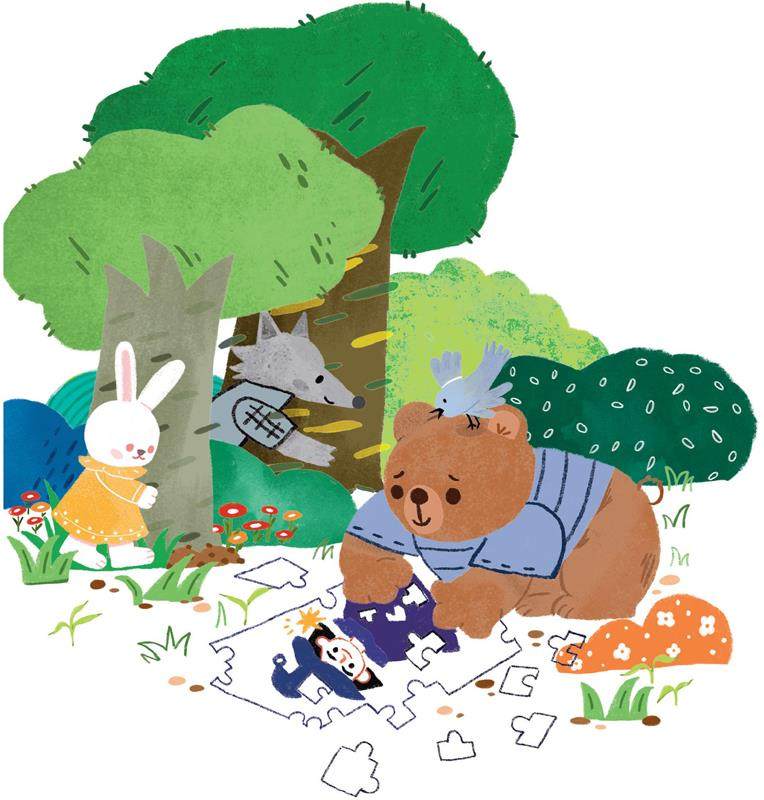 “噢,是拼图呀!”小兔子兴致勃勃地拿起拼图,一块一块地拼起来。