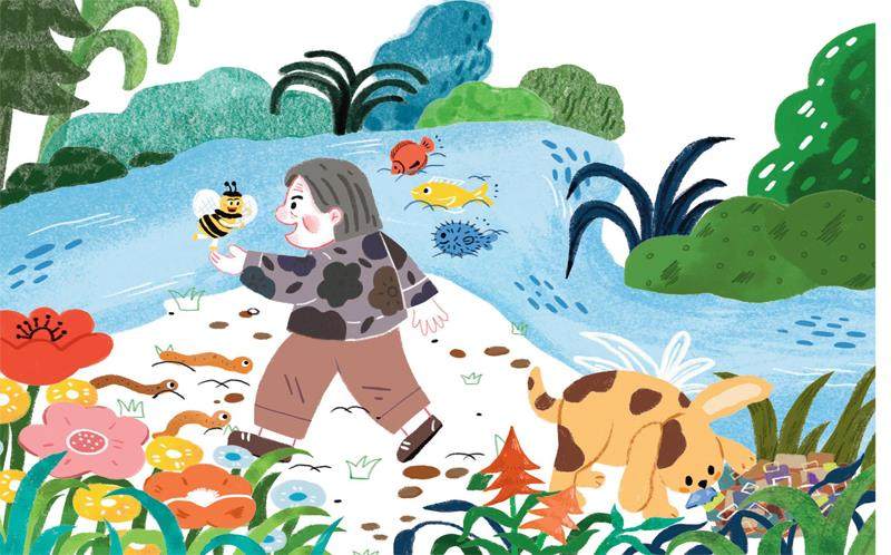 花奶奶喜欢穿花衣服,每天清晨都会穿着不同花色的衣服来到小河边。花奶奶还有一只大狗,她不记得自己哪一年认识了这只狗,反正好久好久了。