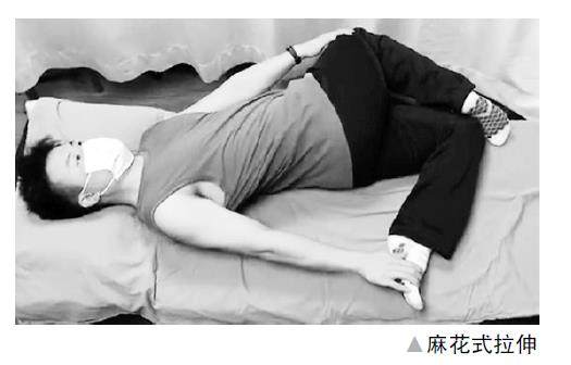 麻花式拉伸:平躺在床上,躯干保持中立位,核心收紧,屈腿,腰部扭向左侧,左手按住右侧膝关节,右手抓住左侧踝关节,充分拉伸,保持一定的时间,对侧同理。(剩余286字)