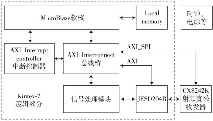 如今软件无线电以其独特的灵活性、可编程性使得通信设备可以适应不同的通信标准、满足不同的应用需求[。软件无线电极大地降低了硬件实现的难度,除了基本的硬件可编程性之外,放大器、滤波器、混频器、AD/DA等其他的硬件功能也可以通过寄存器存入数值的方式进行配置,使得基带与射频之间转换更具有灵活性且易扩展[2-3]