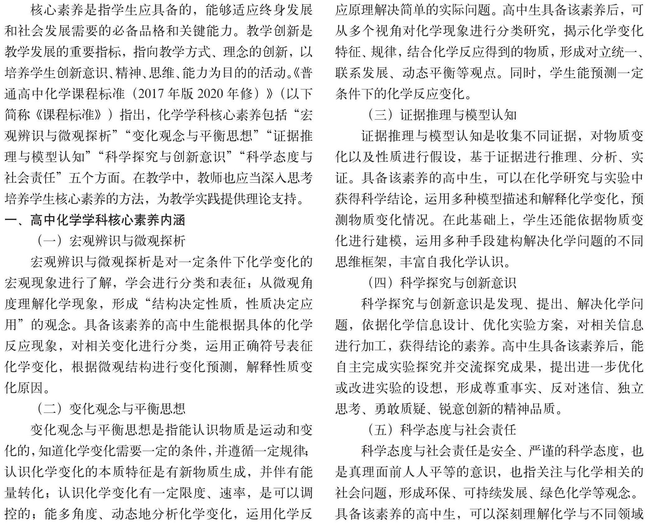 摘 要:《普通高中化学课程标准(2017年版2022年修订)》提出,核心素养体现了化学课程在帮助学生形成未来发展需要的正确价值观、必备品格和关键能力中所发挥的重要作用。在高中化学教学中培养学生的核心素养,有助于提高学生的学习能力,使之形成良好的思想品格。基于高中化学学科核心素养内涵,文章分析了核心素养背景下的高中化学教学创新策略,提出了有关教学创新的建议,以期为教师的教学研究工作提供参考。(剩余5093字)