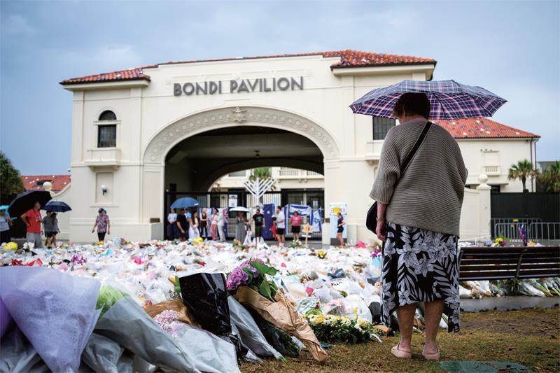 2025年12月20日,澳大利亚悉尼,人们在邦迪海滩附近献花哀悼