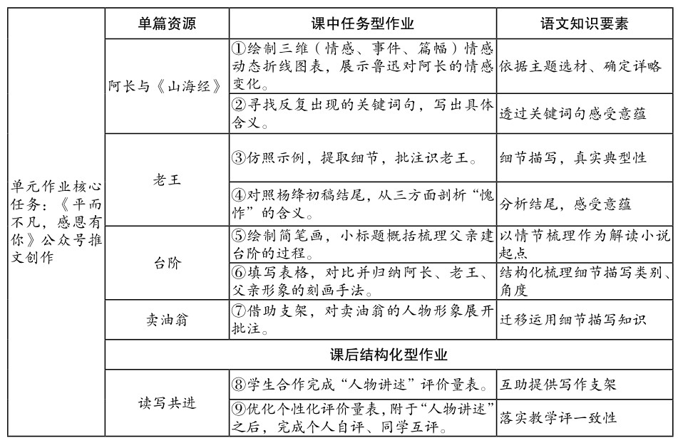 2021年,在教育部办公厅所发布的《关于加强义务教育学校作业管理的通知》及中共中央办公厅、国务院办公厅印发的《关于进一步减轻义务教育阶段学生作业负担和校外培训负担的意见》中,“提高作业设计质量”被反复提及,“作业设计”成为教育领域的高频词,进入广大一线教师的教研视野。摒弃“拿来主义”,探索“作业设计”,语文教师如何切实有为?笔者认为,关键在于语文教师重新定位作业与教学、单篇与单元、支架与评价这几组关系,从而真正实现减负与增效的正向关联。(剩余2532字)