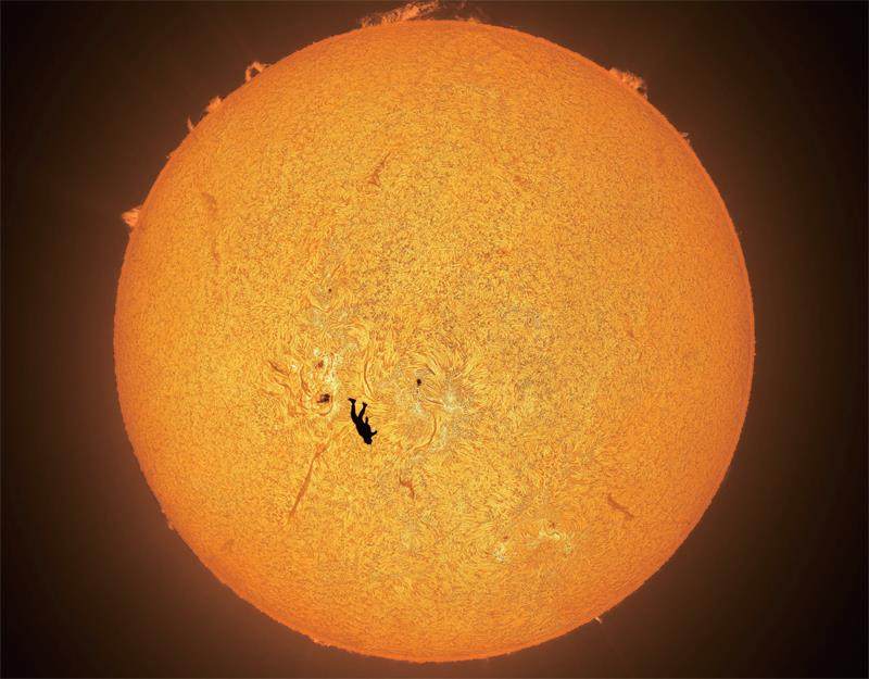 一名跳伞者纵身跃下,在太阳表面投下完美的剪影,背景中可见深色的太阳黑子。摄影师与跳伞者耗费数月精心策划,通过精确把握时机,借助特制太阳望远镜完成了这张震撼人心的作品。