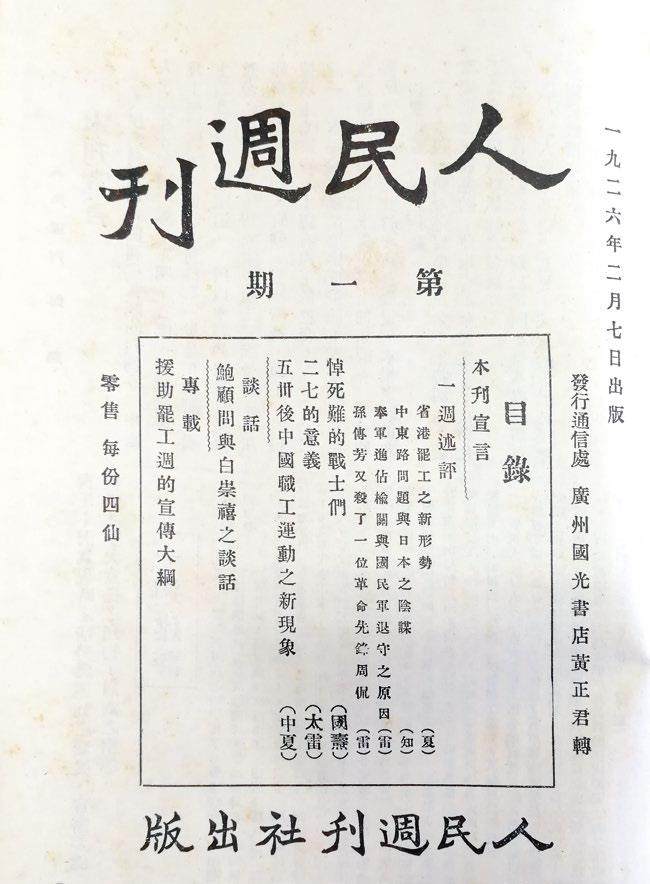 报刊史是政治史、思想史与社会史的交汇点。2026年2月7日是中国共产党早期重要报刊《人民周刊》创刊100周年纪念日。该刊于1926年2月7日至1927年4月10日在广州出版,共发行50期。它作为中共广东区委的机关刊物,在宣传革命理论、指导工农运动、评论时政等方面扮演了至关重要的角色。基于对现存49期《人民周刊》的原始资料(其中第46期缺失)的全面梳理,并采用文献计量与历史分析相结合的方法,对刊物核心作者群体进行数量统计,对刊载的文章进行系统划分,可还原《人民周刊》作为一份大革命时期机关刊物的立体图景,为理解早期中国共产党的宣传理论与实践提供一份基于实证的个案研究。(剩余4312字)
