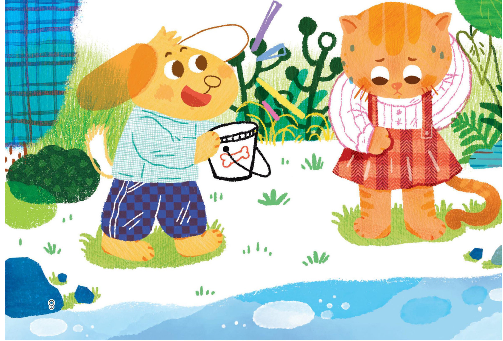 第二天,妙妙哼着小曲来到河边,比约定的时间晚了一些。喵喵正拿着鱼竿钓鱼,回头看到妙妙,赶紧说:“你可来啦!桶呢?”