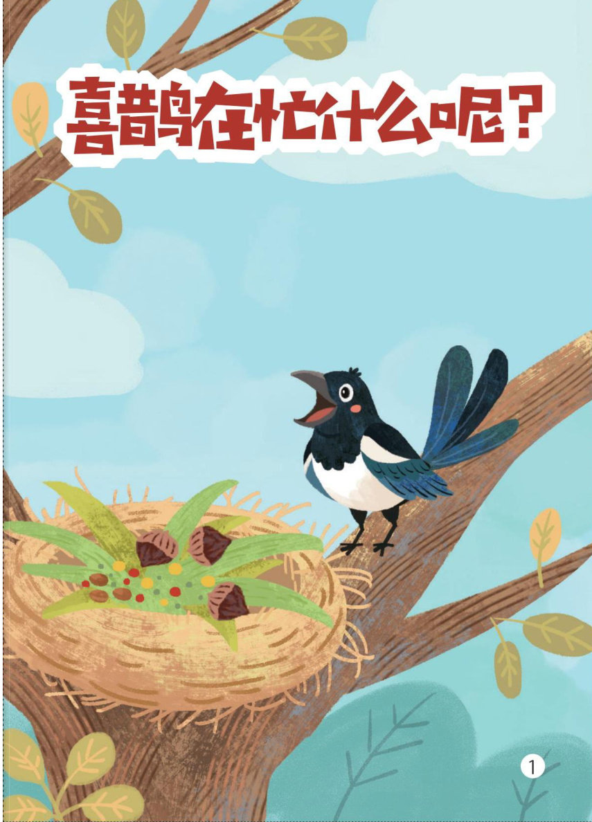 这个秋天,喜鹊忙坏了。他飞遍田野,把红豆、绿豆、栗子一颗颗叼回窝,心里盘算着:“这些够我过冬啦!”