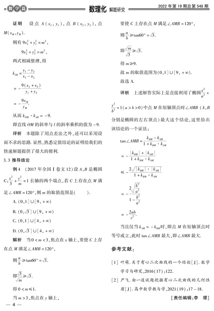 摘要:解析几何知识由于能很好地向同学们渗透各种数学思想方法,培养大家的数学抽象、数学运算和逻辑推理等核心素养,因此其在考查中对大家的能力要求一直较高,这也令不少同学对其心生畏惧. 其实,圆锥曲线中隐藏着非常多优美的结论,有些结论往往还具有共性,本文介绍一组有心二次曲线(含有对称中心的二次曲线,如圆、(剩余303字)