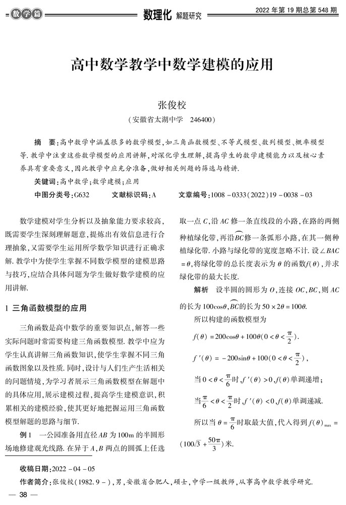 摘要:高中数学中涵盖很多的数学模型,如三角函数模型、不等式模型、数列模型、概率模型等.教学中注重这些数学模型的应用讲解,对深化学生理解,提高学生的数学建模能力以及核心素养具有重要意义,因此教学中应充分准备,做好相关例题的筛选与精讲.