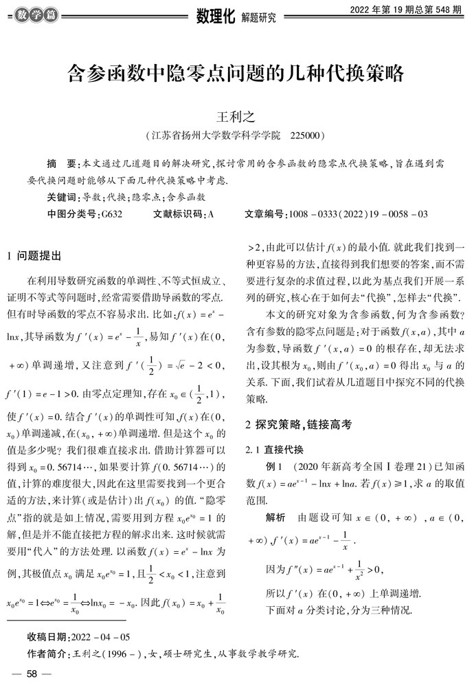 摘要:本文通过几道题目的解决研究,探讨常用的含参函数的隐零点代换策略,旨在遇到需要代换问题时能够从下面几种代换策略中考虑.