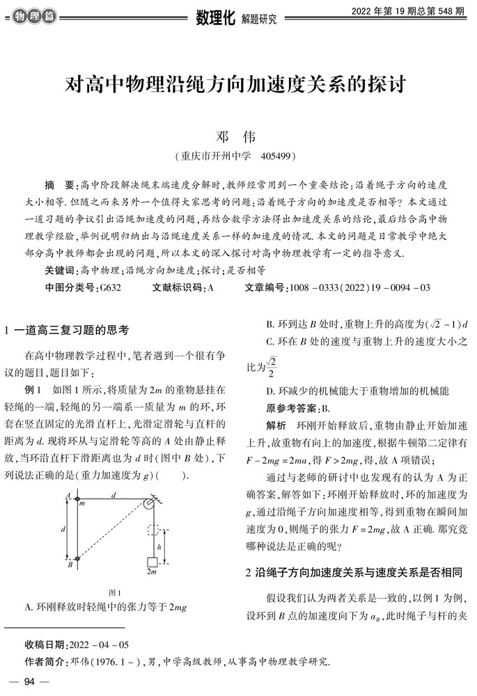 摘要:高中阶段解决绳末端速度分解时,教师经常用到一个重要结论:沿着绳子方向的速度大小相等.但随之而来另外一个值得大家思考的问题:沿着绳子方向的加速度是否相等?本文通过一道习题的争议引出沿绳加速度的问题,再结合数学方法得出加速度关系的结论,最后结合高中物理教学经验,举例说明归纳出与沿绳速度关系一样的加(剩余794字)