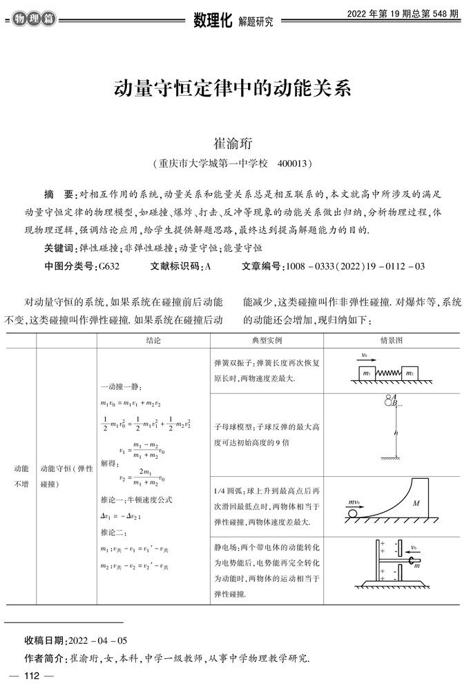 摘要:对相互作用的系统,动量关系和能量关系总是相互联系的,本文就高中所涉及的满足动量守恒定律的物理模型,如碰撞、爆炸、打击、反冲等现象的动能关系做出归纳,分析物理过程,体现物理逻辑,强调结论应用,给学生提供解题思路,最终达到提高解题能力的目的.