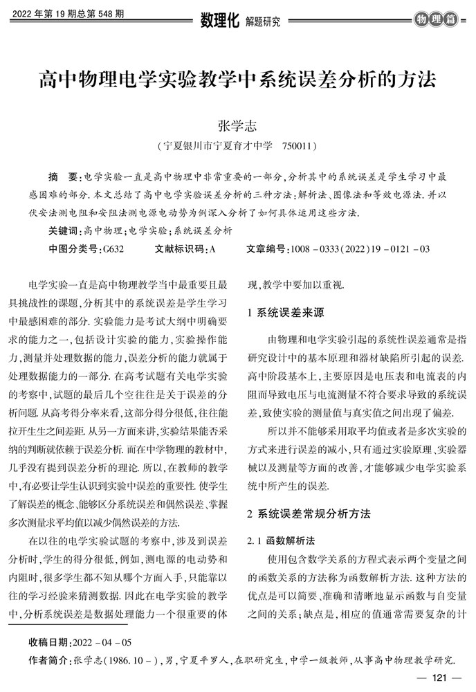 摘要:电学实验一直是高中物理中非常重要的一部分,分析其中的系统误差是学生学习中最感困难的部分.本文总结了高中电学实验误差分析的三种方法:解析法、图像法和等效电源法.并以伏安法测电阻和安阻法测电源电动势为例深入分析了如何具体运用这些方法.