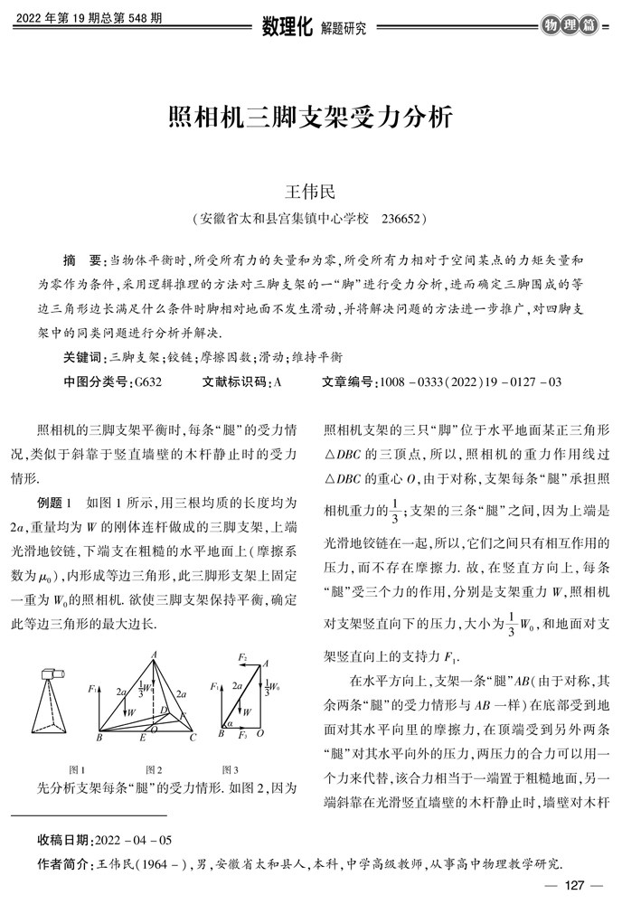 摘要:当物体平衡时,所受所有力的矢量和为零,所受所有力相对于空间某点的力矩矢量和为零作为条件,采用逻辑推理的方法对三脚支架的一“脚”进行受力分析,进而确定三脚围成的等边三角形边长满足什么条件时脚相对地面不发生滑动,并将解决问题的方法进一步推广,对四脚支架中的同类问题进行分析并解决.