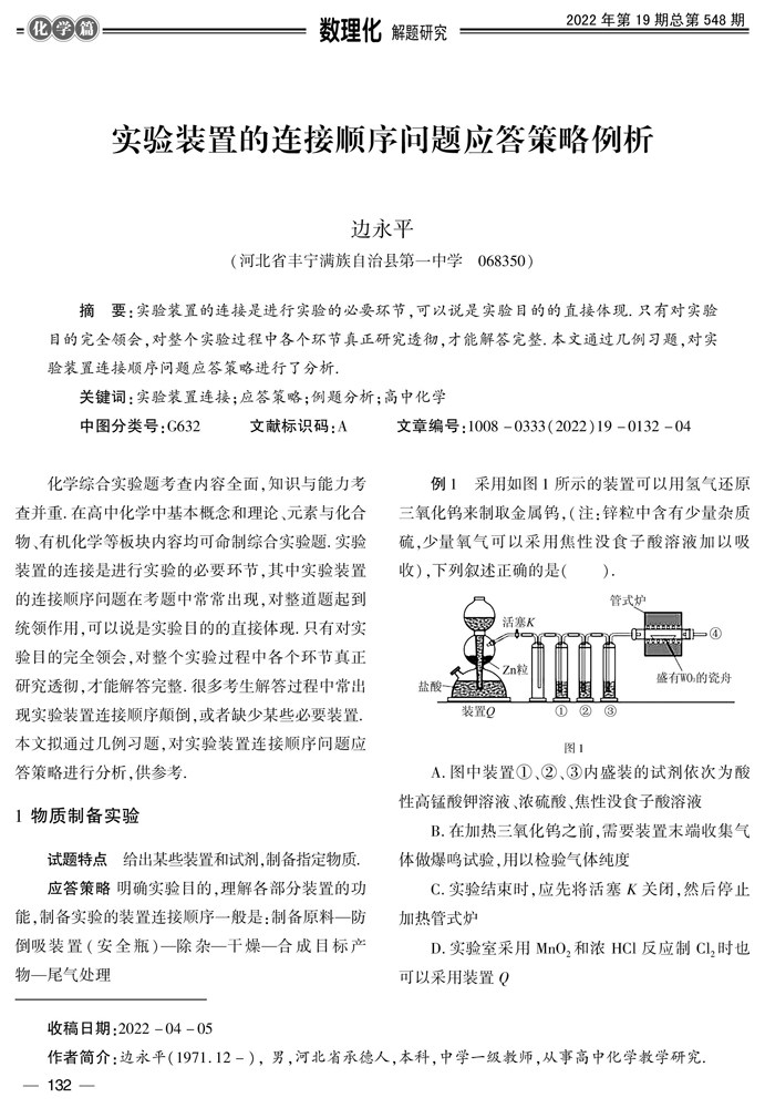 摘要:实验装置的连接是进行实验的必要环节,可以说是实验目的的直接体现.只有对实验目的完全领会,对整个实验过程中各个环节真正研究透彻,才能解答完整.本文通过几例习题,对实验装置连接顺序问题应答策略进行了分析.