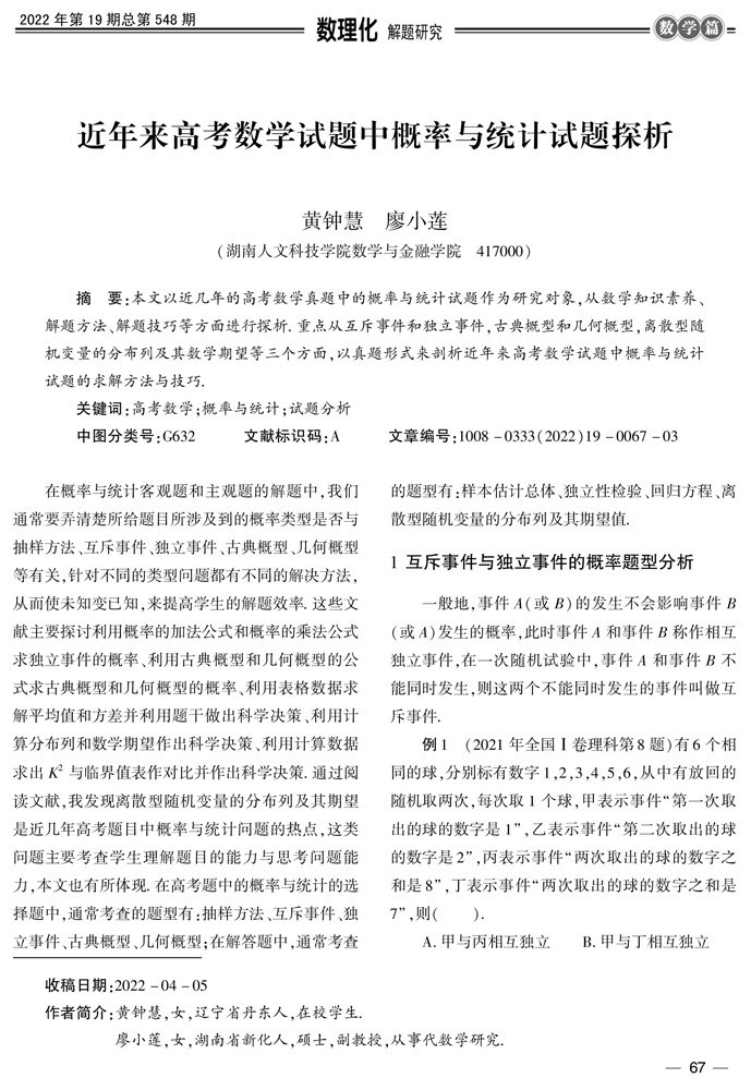 摘要:本文以近几年的高考数学真题中的概率与统计试题作为研究对象,从数学知识素养、解题方法、解题技巧等方面进行探析.重点从互斥事件和独立事件,古典概型和几何概型,离散型随机变量的分布列及其数学期望等三个方面,以真题形式来剖析近年来高考数学试题中概率与统计试题的求解方法与技巧.