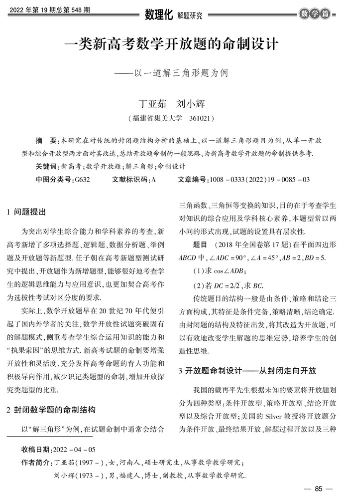 摘要:本研究在对传统的封闭题结构分析的基础上,以一道解三角形题目为例,从单一开放型和综合开放型两方面对其改造,总结开放题命制的一般思路,为新高考数学开放题的命制提供参考.