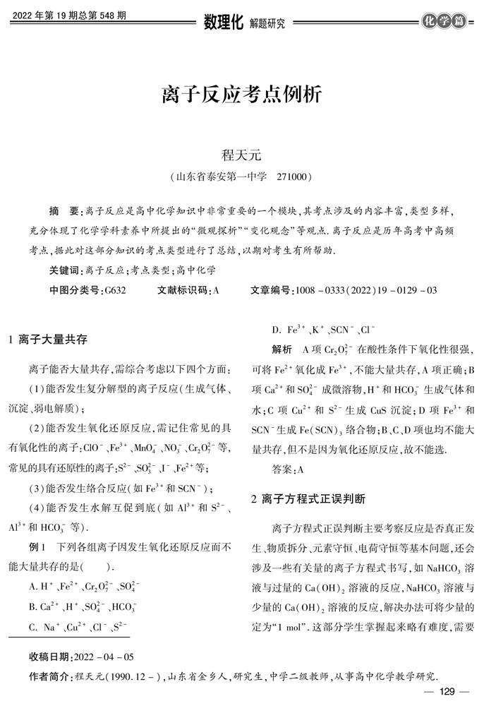 摘要:离子反应是高中化学知识中非常重要的一个模块,其考点涉及的内容丰富,类型多样,充分体现了化学学科素养中所提出的“微观探析”“变化观念”等观点.离子反应是历年高考中高频考点,据此对这部分知识的考点类型进行了总结,以期对考生有所帮助.关键词:离子反应;考点类型;高中化学