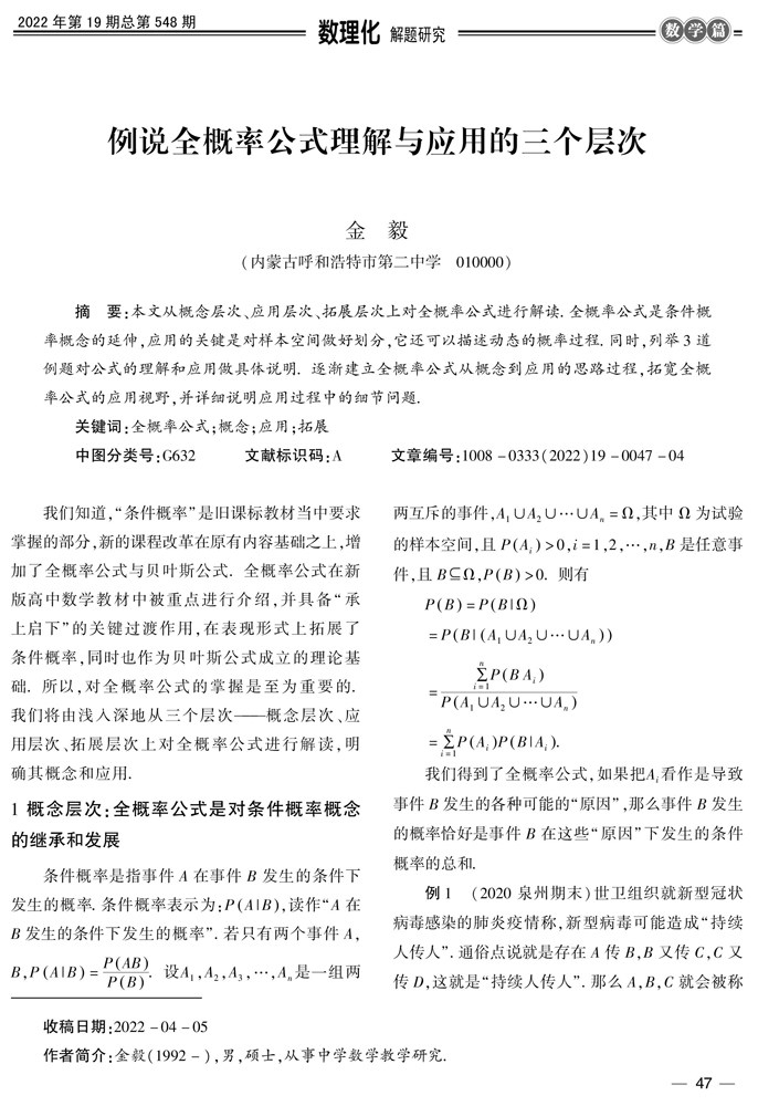 摘要:本文从概念层次、应用层次、拓展层次上对全概率公式进行解读.全概率公式是条件概率概念的延伸,应用的关键是对样本空间做好划分,它还可以描述动态的概率过程.同时,列举3道例题对公式的理解和应用做具体说明. 逐渐建立全概率公式从概念到应用的思路过程,拓宽全概率公式的应用视野,并详细说明应用过程中的细节(剩余1671字)