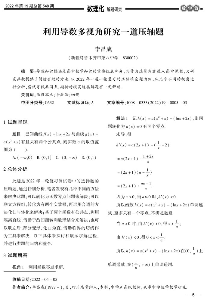 摘要:导数知识模块是高中数学知识的重要组成部分,其作为选修内容进入高中课程,为研究函数提供了简洁有效的方法.以2022年一道一轮复习的压轴填空题为例,从几个不同的视角进行分析,尝试寻找共同点,期待对提高这类解题有一定帮助.