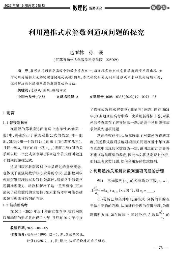 摘要:数列通项问题是高考中的考查重点之一,而递推式数列经常伴随着通项问题出现,如何利用好递推式是解决该类问题的关键.因此,本文研究目的是利用递推式来求解数列通项问题,探讨解决数列通项问题的解题策略和方法.