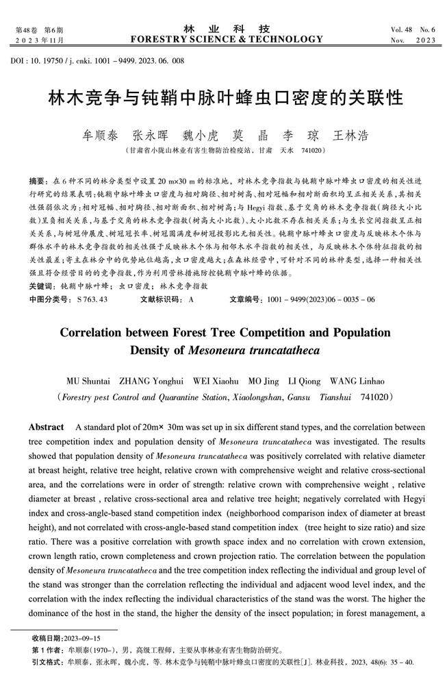 林木竞争与钝鞘中脉叶蜂虫口密度的关联性