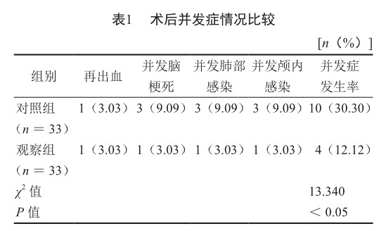 摘 要 目的:观察分析小骨窗手术对高血压脑出血患者治疗效果及预后的影响。方法:将66名高血压脑出血患者随机分为对照组和观察组各33例,对照组采取传统手术治疗,观察组采取小骨窗手术治疗。观察二组治疗效果、并发症及致残发生等情况。结果:观察组术后并发症发生比例、致残比例、日常生活能力量表评分、临床神经功能缺损评分低于对照组;平均出院时间短于对照组(均P