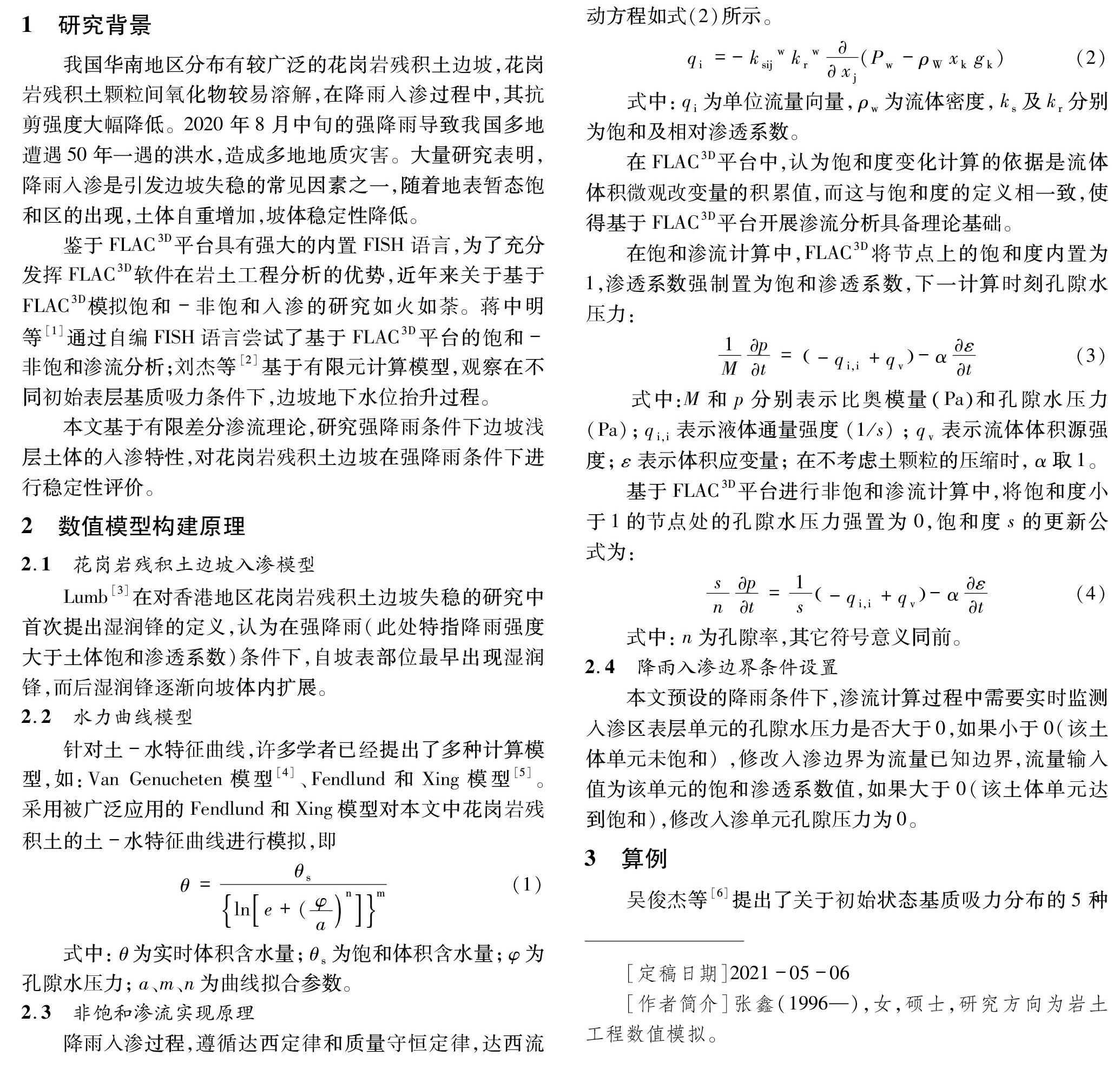 [摘 要]:花岗岩残积土边坡在强降雨条件下,容易发生浅层土体溜坍、垮塌等水毁灾害,而边坡浅层土体降雨入渗特性对其产生机理及过程、规模起着关键性作用。文章建立了坡角为50°的三维边坡流-固耦合数值模型,完成了暴雨条件下的饱和-非饱和渗流分析,得出了强降雨入渗特征及基于此的边坡稳定特性。结果表明:随降雨历时的变化曲线上突变点。(剩余3650字)