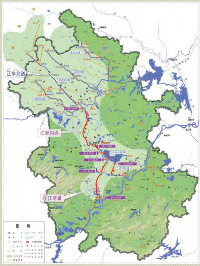 引江济淮工程自南向北可划分为引江济巢、江淮沟通和江水北送三大工程。引江济巢工程为济淮提供水源并兼顾巢湖生态引水;江淮沟通工程主要服务于济淮调水和江淮航运;江水北送工程是将长江水向淮河以北地区输水或配水,输水线路总长 723km 。引江济淮航运工程(安徽段)充分利用了引江济淮工程中引江济巢段输水渠道、巢湖湖区航道和江淮沟通段输水渠道,工程分为引江济巢段的菜子湖线路、兆河航道及江淮沟通段,并通过派河口船闸、蜀山船闸等7座航运枢纽,开辟新的江淮运河,实现淮河航道网与长江航道网互联互通。(剩余4088字)