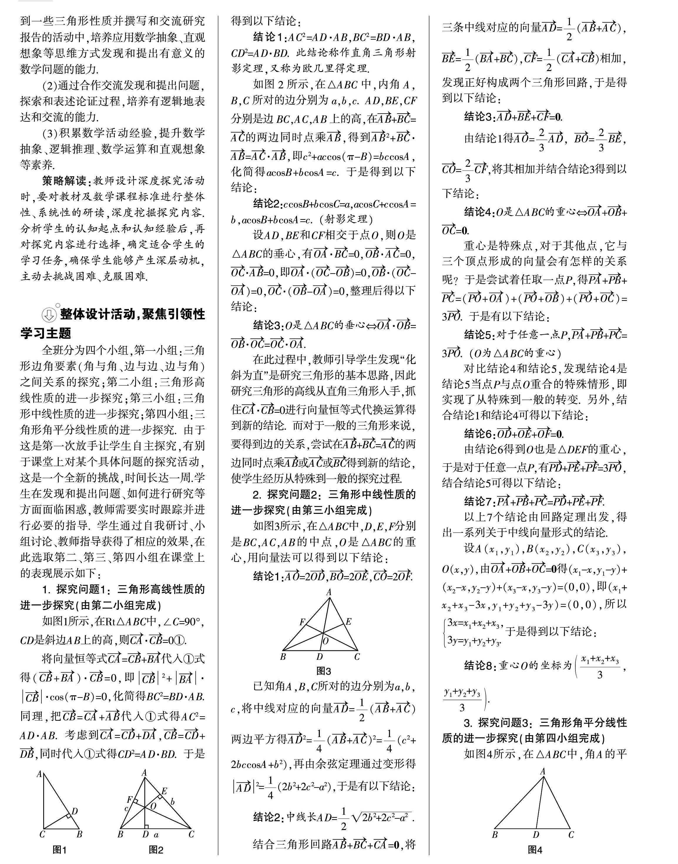 [摘 要] 基于深度学习的数学探究活动促使学生主动参与、积极体验、深入思考,它指向发展学生的高阶思维,培养学生创新意识和实践能力.文章以“用向量法研究三角形的性质”为例,结合教学实践探讨数学深度探究活动教学策略.