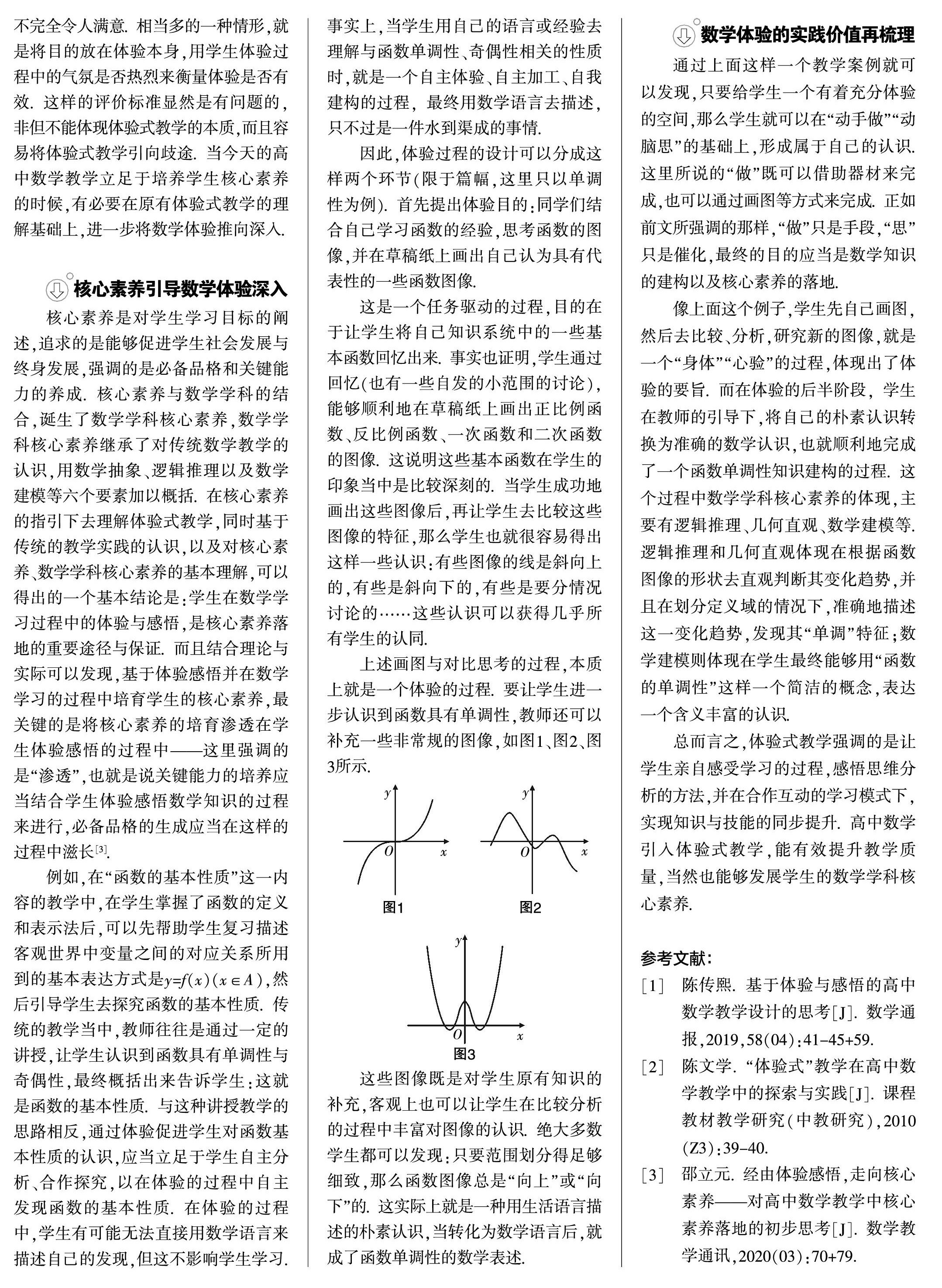 [摘 要] 体验更强调学生学习过程中的“身体”与“心验”. 这里所说的“身体”带有“做中学”的意思,“心验”主要是指思维活动. 体验的价值在于将体验中形成的经验与认识,转化为数学认识,并且最终用数学语言准确地表达出来. 这是一个去粗取精、去伪存真的过程,是一个将数与形的规律逐步体现出来的(剩余3546字)