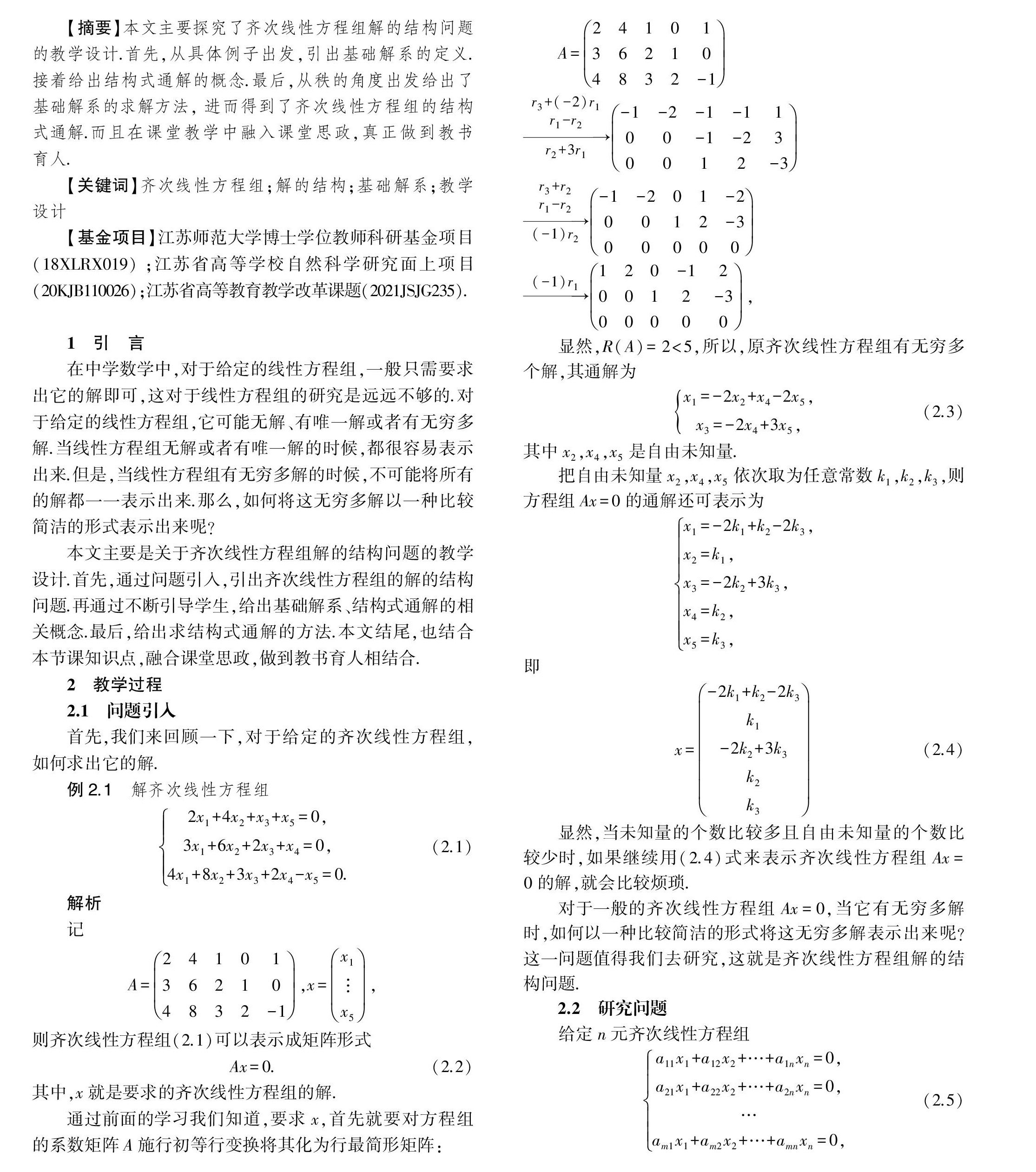齐次线性方程组解的结构问题的教学设计