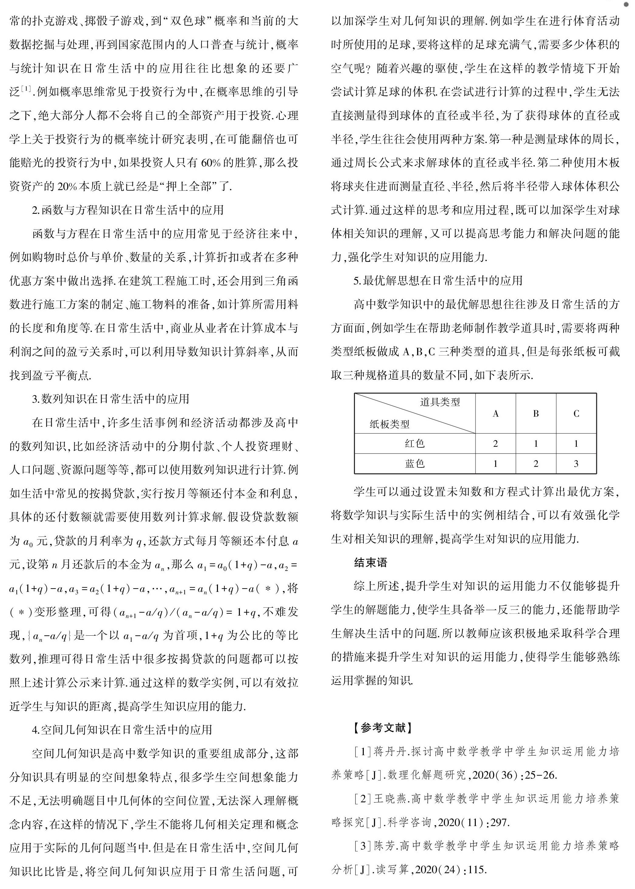 【摘要】培养学生的知识运用能力是高中数学教学活动中极为关键又极容易被忽略的环节,所以高中数学教师在开展教学活动的时候就应该采取必要的措施提升学生的知识运用能力.基于此,笔者在本文中简单分析了培养学生知识运用能力的重要性以及现状之后,着重探讨了如何在高中数学教学中提升和培养学生的知识运用能力.