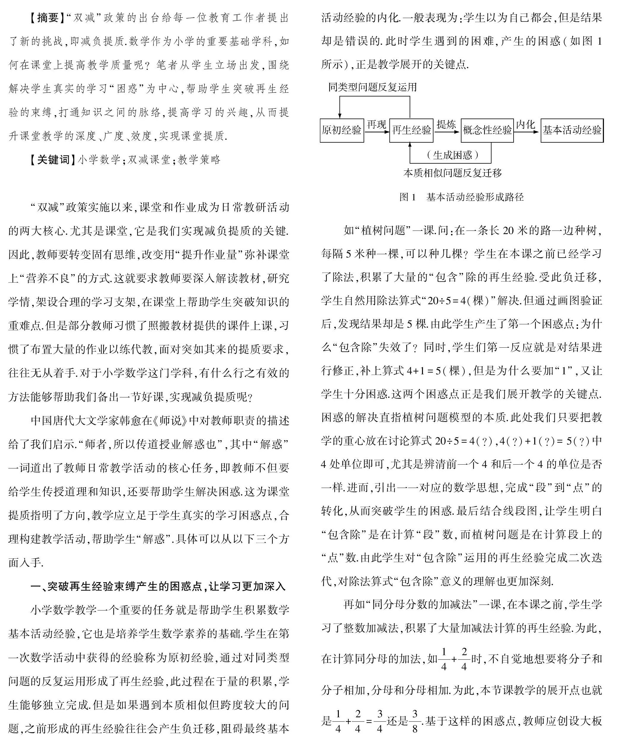 【摘要】“双减”政策的出台给每一位教育工作者提出了新的挑战,即减负提质.数学作为小学的重要基础学科,如何在课堂上提高教学质量呢?笔者从学生立场出发,围绕解决学生真实的学习“困惑”为中心,帮助学生突破再生经验的束缚,打通知识之间的脉络,提高学习的兴趣,从而提升课堂教学的深度、广度、效度,实现课堂提质.(剩余3924字)