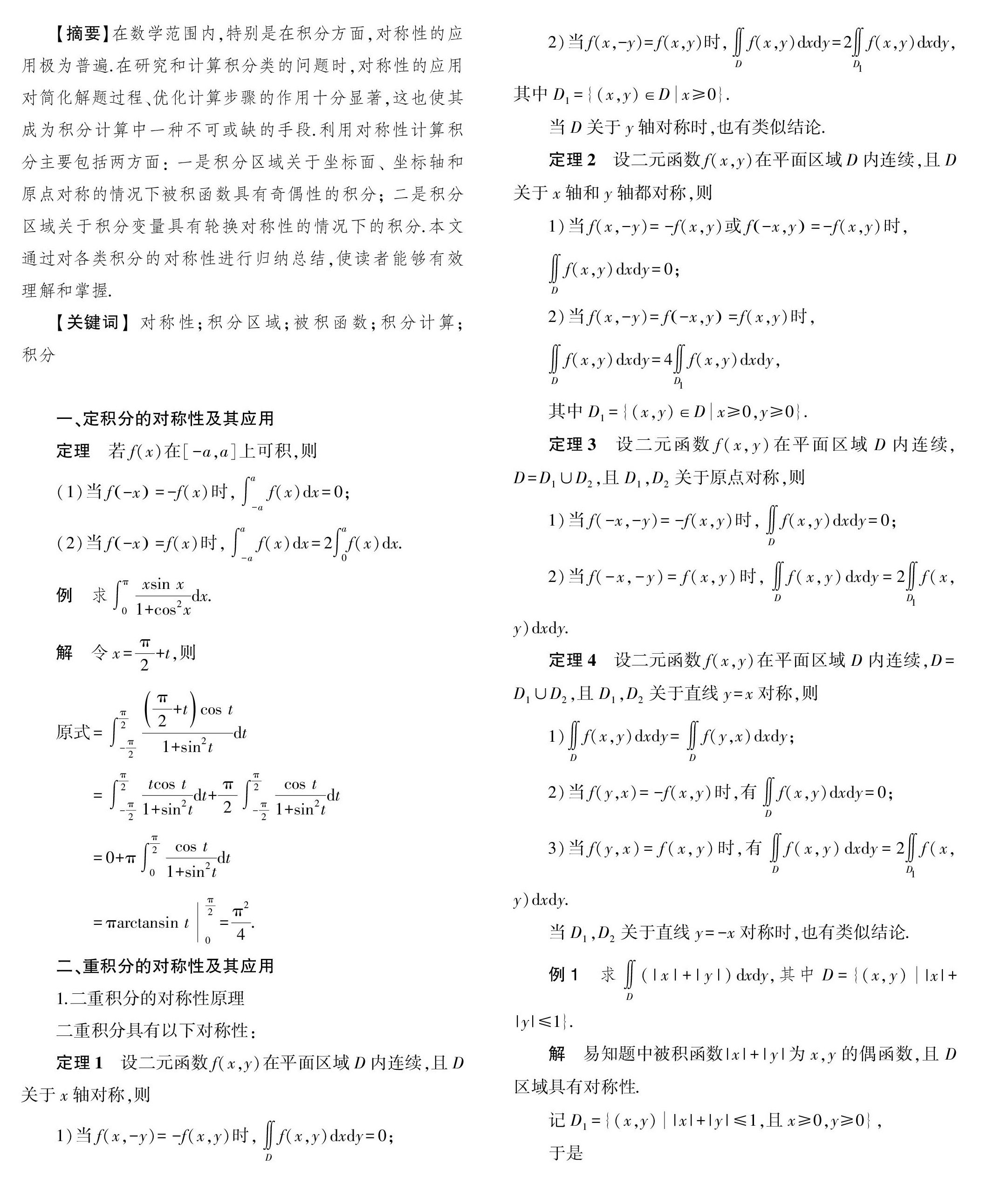 【摘要】在数学范围内,特别是在积分方面,对称性的应用极为普遍.在研究和计算积分类的问题时,对称性的应用对简化解题过程、优化计算步骤的作用十分显著,这也使其成为积分计算中一种不可或缺的手段.利用对称性计算积分主要包括两方面: 一是积分区域关于坐标面、 坐标轴和原点对称的情况下被积函数具有奇偶性的积分;(剩余4495字)