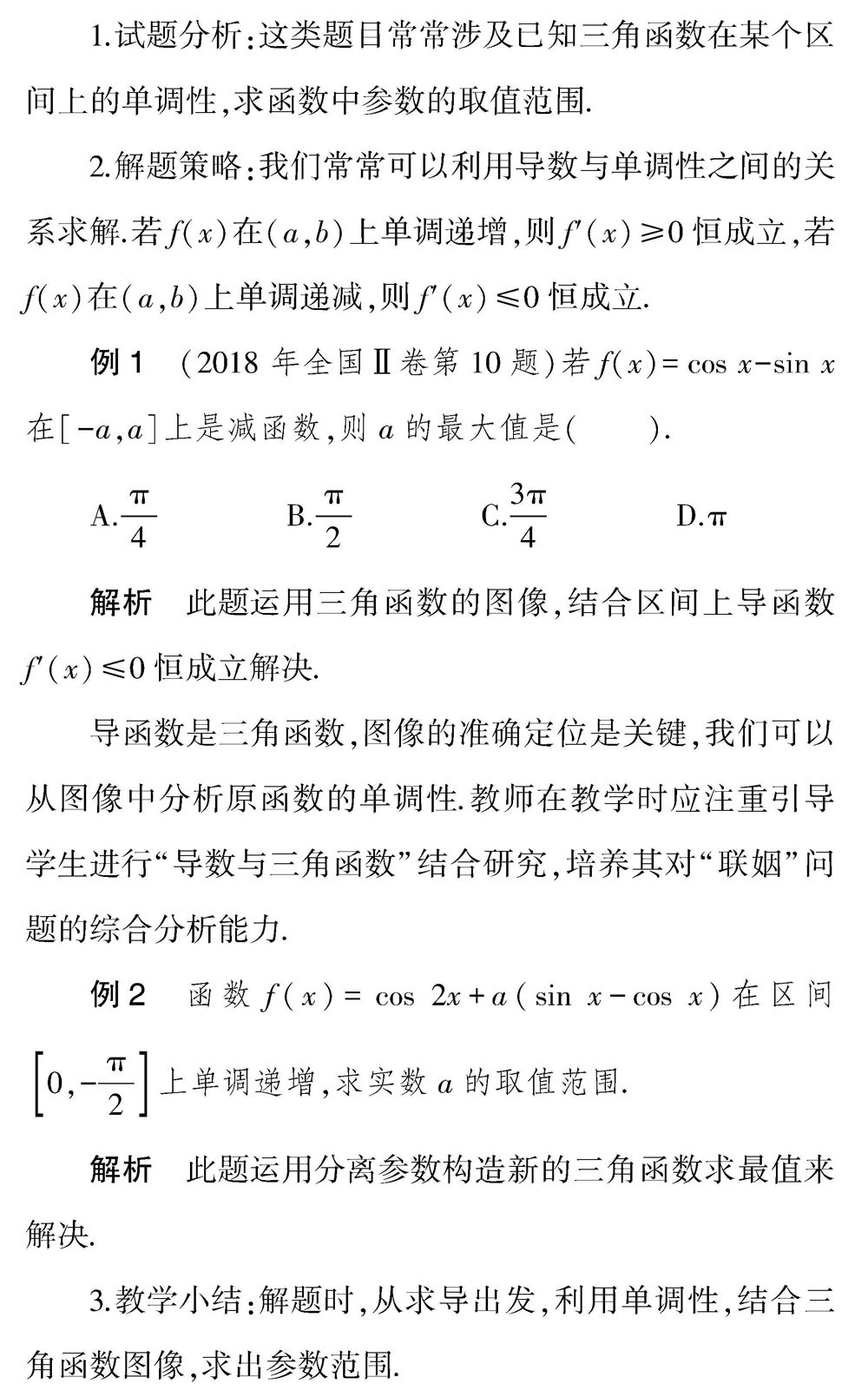 【摘要】 新高考背景下导数与三角函数结合,题型较为复杂,涉及范围较广,难度比较大,这对教师教学水平提出了很高要求.本文主要从函数的基本性质,即单调性、奇偶性、对称性,以及大考中命题点分析来阐述这类“联姻”问题在教学中的教学策略研究.