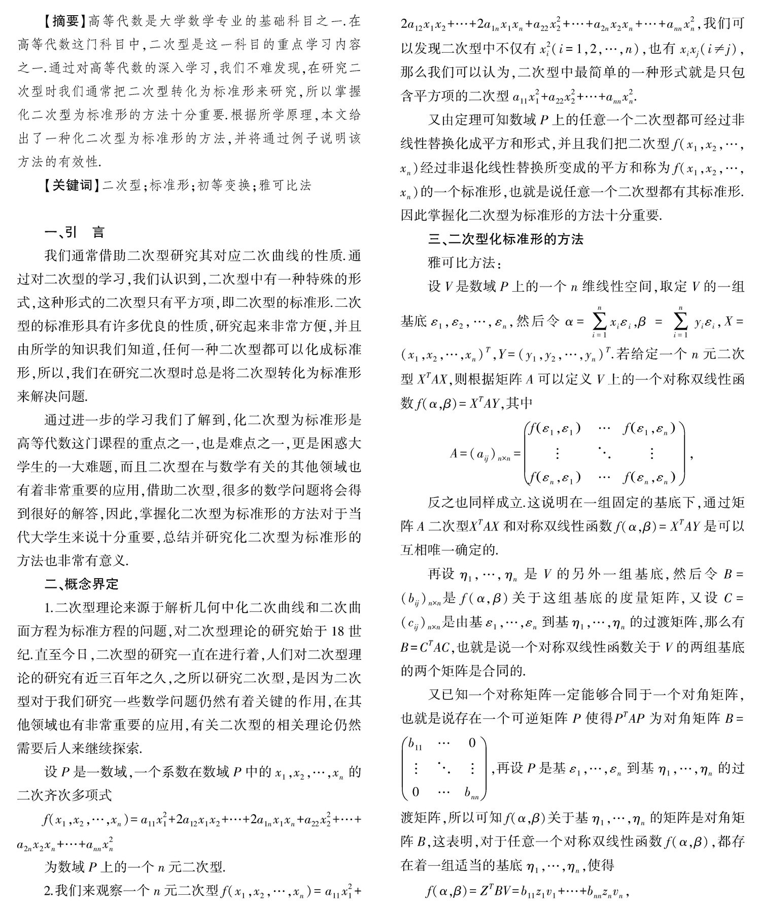 【摘要】 高等代数是大学数学专业的基础科目之一.在高等代数这门科目中,二次型是这一科目的重点学习内容之一.通过对高等代数的深入学习,我们不难发现,在研究二次型时我们通常把二次型转化为标准形来研究,所以掌握化二次型为标准形的方法十分重要.根据所学原理,本文给出了一种化二次型为标准形的方法,并将通过例子(剩余6047字)